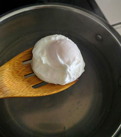 3) Shocking the egg with vinegar or lemon juice helps the egg retain that beautiful shape. Also, the dangly white egg threads that you dread, do not come swimming apart!